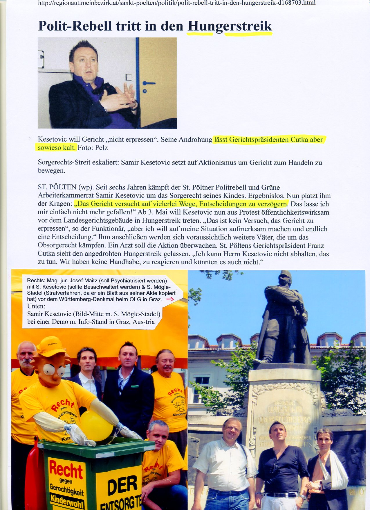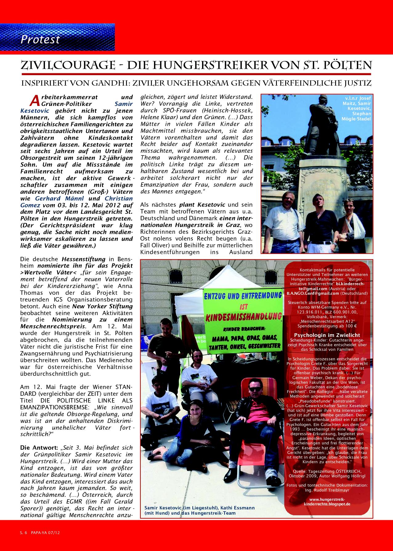 Beispiele - Österreich _____________________________________________________________________________ HUNGERSTREIK Jahrelanges Warten auf ein Urteil im Obsorgestreit. Hungerstreik auf dem Platz vor dem Landesgericht St.Pölten.Der Gerichtspräsident war klug genug, die Sache nicht noch medienwirksamer eskalieren zu lassen und ließ die Väter gewähren [Magazin PAPA-YA - 07/12]
