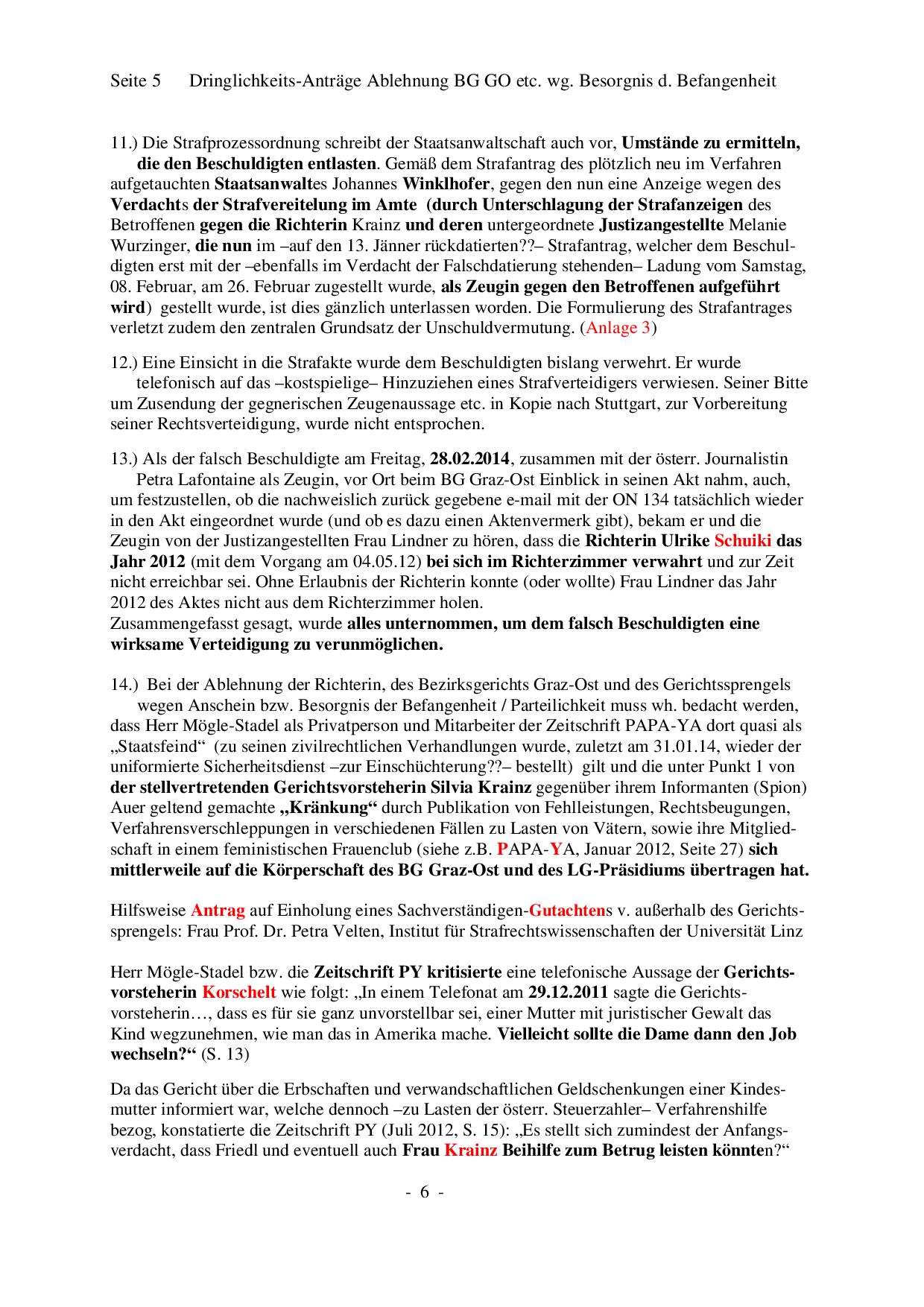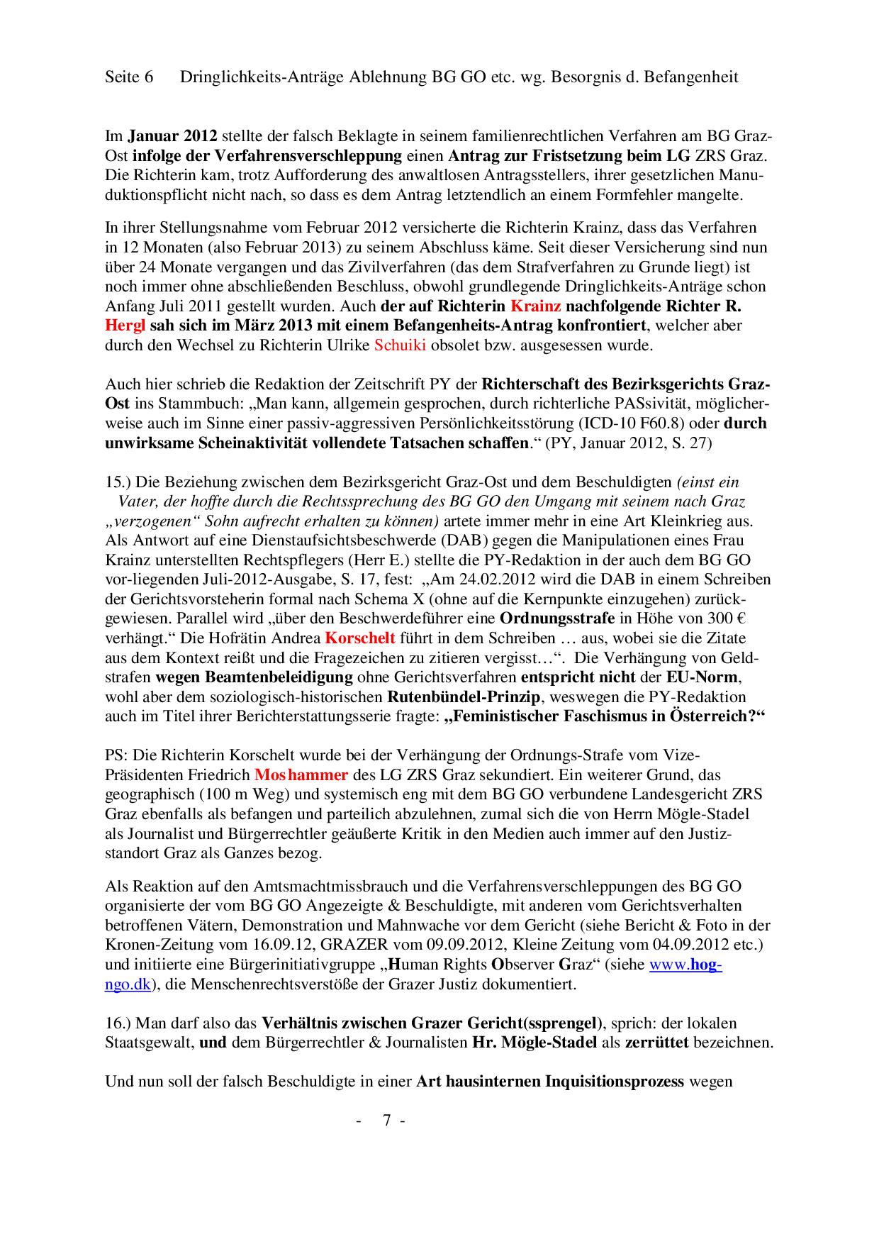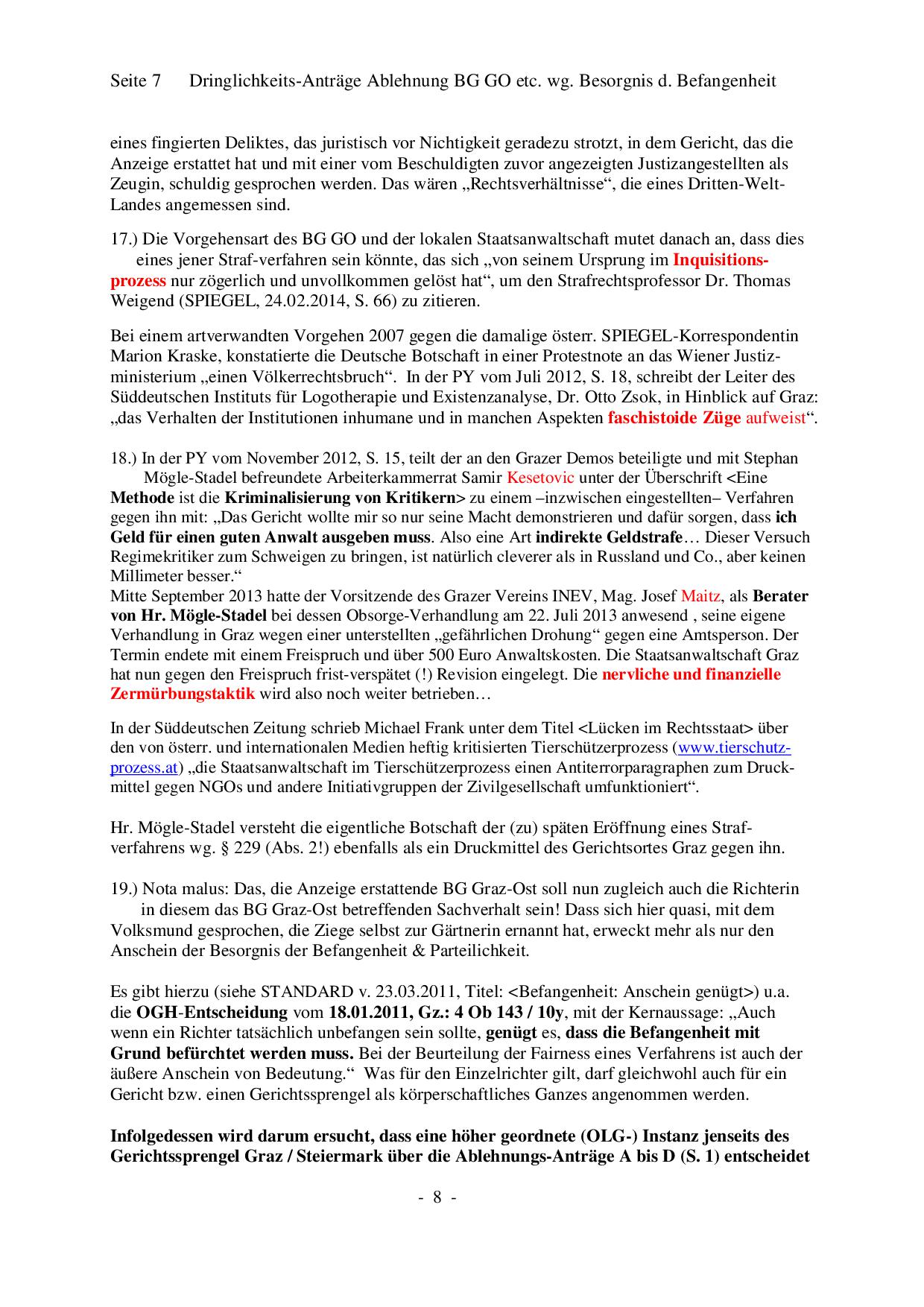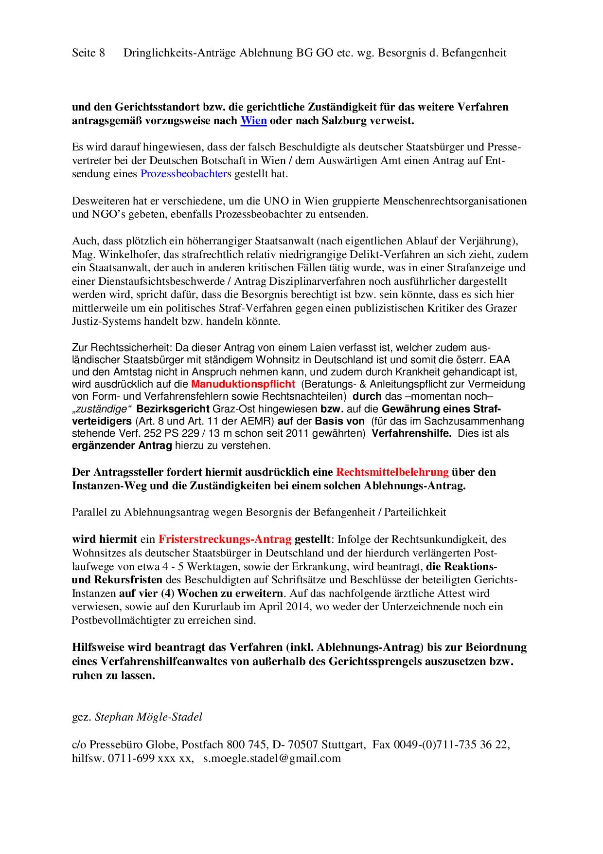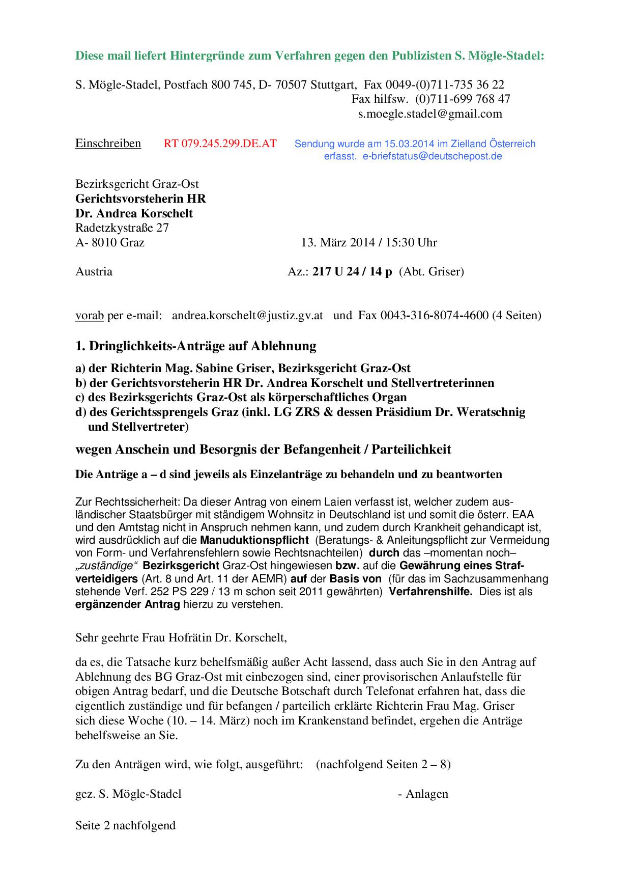 Bezirksgericht Graz Ost (BG GO) _____________________________________________________________________________ Ablehnungsantrag wegen Befangenheit/Parteilichkeit In einem aktuellen Verfahren läuft ein Ablehnungsantrag gegen Richterin, Gerichtsvorsteherin, Bezirksgericht Graz Ost und Gerichtssprengel Graz! (Die Kopien unten wurden uns nicht von Hr. Moegle-Stadel direkt zur Verfügung gestellt.) Da einige Punkte und Formulierungen aus diesem Ablehnungsantrag dem Grazer Gericht nicht gefallen haben, hat die Grazer Justiz im Jahr 2013 ein Strafverfahren u.a. wegen "Ehrverletzung österreichischer Amtspersonen", übler Nachrede und Verleumung (26 Anklagepunkte) gegen den investigativen Journalisten, Buchautoren und Beschwerdeführer eingeleitet und an die Staatsanwaltschaft Stuttgart abgegeben. Dieses Verfahren wurde im Jahre 2017 von einem deutschen Gericht endgültig eingestellt. (Link) Situation der österreichischen Presse: Presse und Meinungsfreiheit in Gefahr