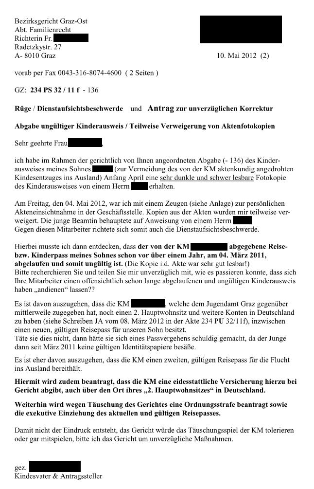 _____________________________________________________________________________ Unbeantwortete Dienstaufsichtsbeschwerde - Soll sich der Fall Viktor H. wiederholen? Im Fall Viktor H. durfte die Mutter freiwillig die Kinderpässe bei ihrem Anwalt hinterlegen, nachdem die Gefahr der Auslandsverbringung der beiden Töchter auftauchte. Hier nun durfte die KM einen alten, vergilbten und ungültigen Ausweis abgeben. Den Hinweisen des Kindesvaters, dass die KM noch einen zweiten Hauptwohnsitz im Ausland aufrecht erhält und dort schon längst einen neuen, aktuellen Kinderreisepaß beantragt hat bzw. haben könnte, wurde von Seiten der Richterin nicht nachgegangen. Wieder liefert so diese Richterin eine Vorlage für eine Kindesentführung, zumal der Gutachter Dr. Willmann nun eine Obsorge-Übertragung (wie bei Viktor H.) anregt und man mit der schon angedrohten Kindesentführung durch die KM nach USA nun dringlicher rechnen muss.