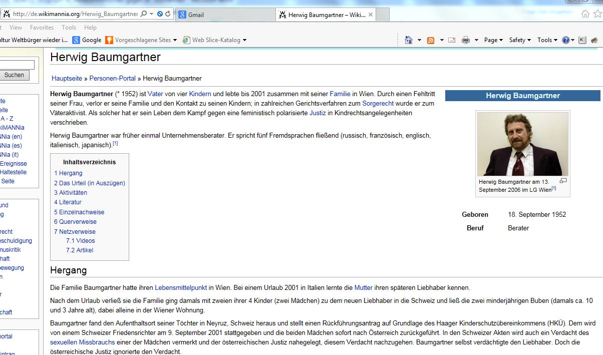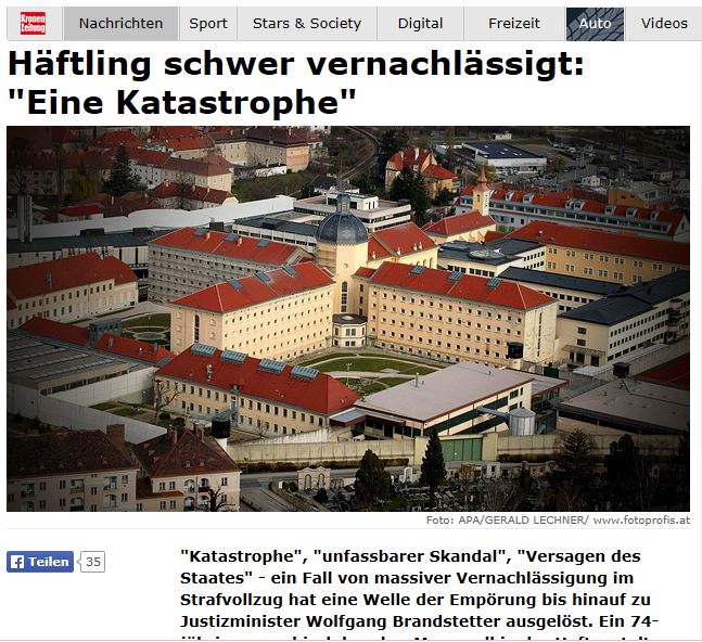 Download Buch "Anklage gegen Österreich -- Justiz-Gewalt gegen Kinder" (Red. Anm.: Dieses Buch sollte als Anklage beim UNO-Menschenrechtsrat in Genf eingereicht werden, was durch die Inhaftierung von Mag. Herweig Baumgartner verhindert wurde. Link zur Hintergrundgeschichte hier.) Seit sieben Monaten sitzt Baumgartner nun in Untersuchungshaft. Weil er während dieser Zeit seine Mutter nicht habe anrufen dürfen, warf er dem Richter Verletzung der Menschenrechte vor: "Herr Rat, Sie quälen mich." Kriminelle Organisation? Herwig Baumgartner wird die Bildung einer kriminellen Organisation vorgeworfen: Der Väteraktivist ist mit einer Homepage, einem Buch ("Anklage gegen Österreich") sowie Anzeigen gegen Richter und Politiker aktiv geworden. Im vergangenen November wurde der vierfache Vater bei einem Gerichtsverfahren in Wien verhaftet, seitdem befindet er sich in Untersuchungshaft. Gemäß der Paragrafen 246 und 278b StGB geht es in Baumgartners Fall um die Gründung einer "staatsfeindlichen Verbindung" bzw. um die Beteiligung an einer "terroristischen Vereinigung". Im Gegensatz zum Strafverfahren gegen die Tierschützer - bei ihnen kam der Mafiaparagraf zur Anwendung. Der Strafrahmen für die Väter - neben Baumgartner wurde noch gegen zwölf andere Mitglieder von Väterrechtsorganisationen ermittelt - reicht von einem Jahr Haft (Teilnahme an einer staatsfeindlichen Verbindung) bis zu fünfzehn Jahren (für Terroristenanführer). Gestern beantragte er, dass Justizministerin Claudia Bandion-Ortner als Zeugin einvernommen werde. Eine Entscheidung dazu stand gestern noch aus. Als Baumgartner den Saal verlässt, nimmt er jene Aktenberge mit, auf die sein Fall inzwischen angewachsen ist. Baumgartner galt auch lange Zeit als Sprachrohr jener Bürgerrechtsbewegung, die sich für eine bessere rechtliche Position der Trennungsväter im Bereich der Obsorge und der Besuchsrechte einsetzt. Die Unterstützung ist aber im Gegensatz zum ersten Verhandlungstag am 28. Mai überschaubar. Damals ist eine große Zahl von Unterstützern angereist, vor dem Gericht wurden Plastikpuppen verstreut, es gab eine Kundgebung. Diesmal legt eine Handvoll Sympathisanten vor dem Linzer Landesgericht auf zwei Seiten die "Leidensgeschichte eines Vaters von vielen" auf. Als Baumgartner des Saals verwiesen wird, macht sich Unruhe breit, drei Männer und eine Frau stehen auf und gehen, Baumgartner sagt zum Richter: "Auf Wiedersehen und bleiben sie weiter so gerecht." Am 15. Juli geht es weiter Als später ein Zeuge einvernommen wird, der gegen ihn aussagt, ist Baumgartner - nach einer Belehrung des Richters - wieder im Saal zugelassen. Der Zeuge war einst sein Zellengenosse ((Anm.: auch als Justizspitzel bekannt!)), er erläutert, wie Baumgartner in epilepsieähnlichen Zuständen davon gesprochen haben soll , im Geiste Richter und Gutachter umzubringen. ((Anm.: Dies nahm man als Anlass ihn auf unbestimmte Zeit in Sicherheitsverwahrsam zu nehmen!)) Wie die Anwältin von Baumgartner allerdings anmerkt, soll der Zeuge , der wegen gewerbsmäßigen Betrugs verurteilt ist, mehrere Vorstrafen besitzt und sich auch derzeit in Haft befindet, in seinem Brief, in dem er die Anschuldigungen gegen Baumgartner erhebt, ((die Justiz)) darum bitten, dass bei seiner nächsten Anhörung "ein gutes Wort" für ihn eingelegt werde. Die nächste Tagsatzung ist für den 15. Juli anberaumt. Das Auftreten gegenüber Angehörigen der Justiz zusammen mit Verleumdung und militanter Kritik an Entscheidungsträgern weise "auf Tatbestände zumindest versuchter Organisationsdelikte" hin, begründete Justizministerin Claudia Bandion-Ortner die Terrorermittlung gegen Väterrechtsaktivisten. ((Anm.: Eine solche verbale Konstruktion wäre in Deutschland von SZ, Dr. Heribert Prantl, SPIEGEL, FAZ & Co. in der Luft zerpflückt worden...)) Quelle: "Die Presse", Print-Ausgabe, 25.06.2010 _____________________________________________________________________________"Katastrophe", "unfassbarer Skandal", "Versagen des Staates" - ein Fall von massiver Vernachlässigung im Strafvollzug hat eine Welle der Empörung bis hinauf zu Justizminister Wolfgang Brandstetter ausgelöst. Ein 74-jähriger psychisch kranker Mann soll in der Haftanstalt Krems-Stein so lange in seiner Zelle unversorgt gewesen sein, bis er "Verwesungsgeruch" verströmt habe. Die Staatsanwaltschaft ermittelt wegen Quälens eines Gefangenen. Der Minister verspricht erneut "umfassende Reformen". http://www.krone.at/Oesterreich/Haeftling_schwer_vernachlaessigt_Eine_Katastrophe-Skandal_im_Gefaengnis-Story-405046