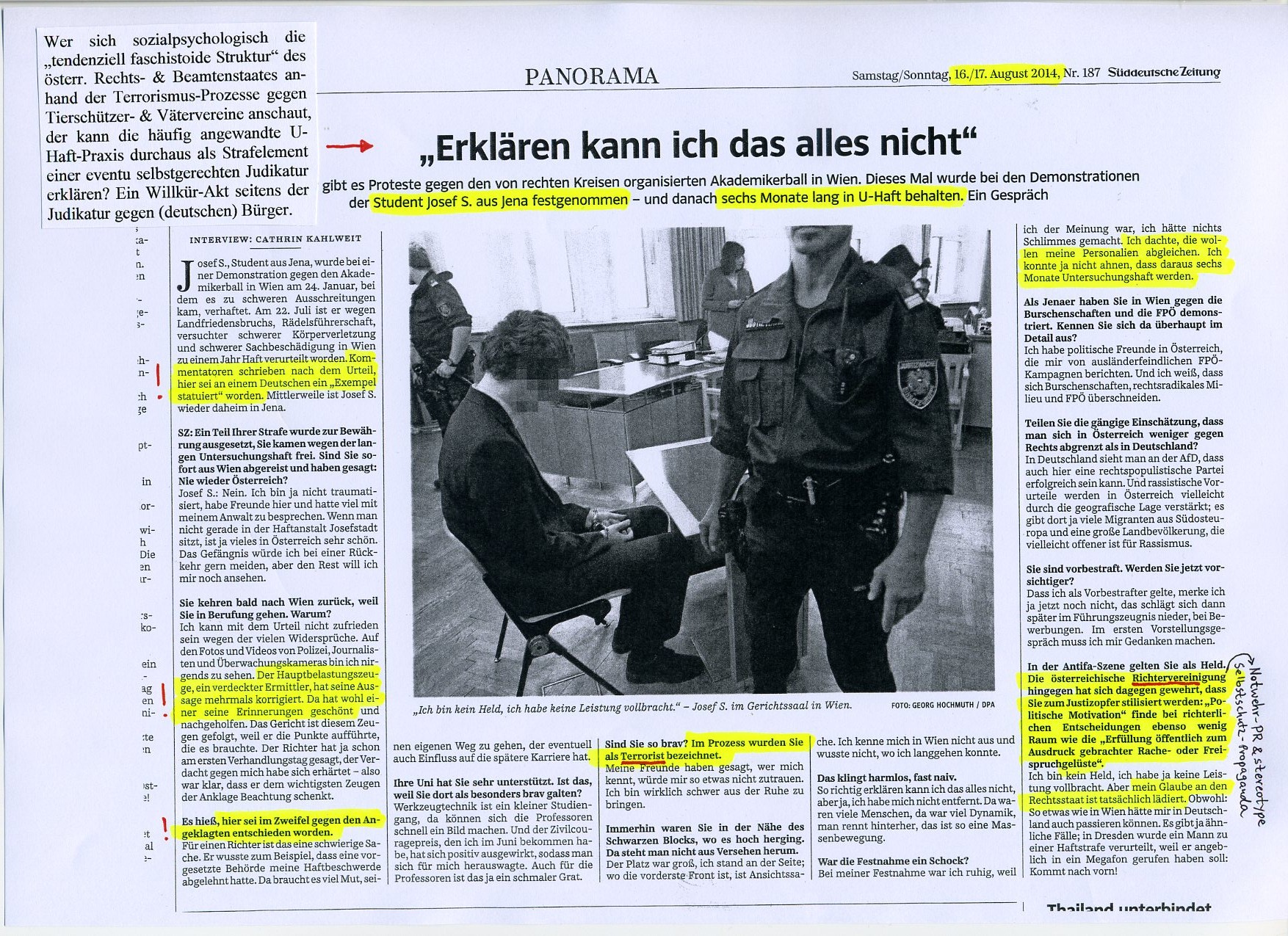 Untersuchungshaft für Student aus Jena [Süddeutsche Zeitung, 16./17.August 2014]