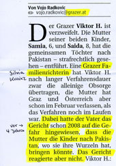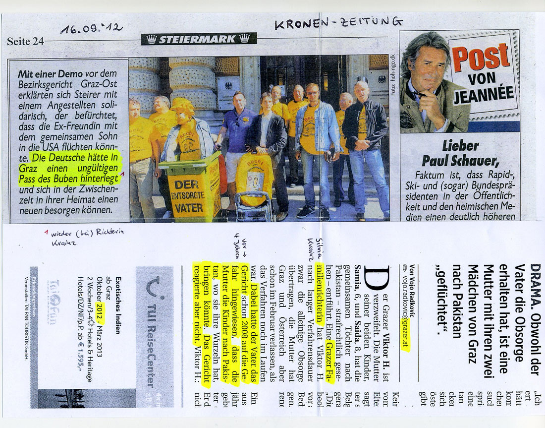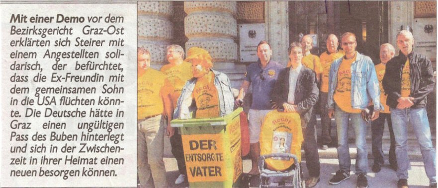 DEMO vor Bezirksgericht Graz-Ost Die steierische KRONEN-Zeitung brachte am 16.09.2012 eines der Mahnwachen-Fotos vor jenem Gericht, das von der KM den alten abgelaufenen Kinderreisepaß des Sohnes von Stephan M. akzeptiert hat (BG Graz-Ost) und dessen zuständige Richterin einen Spitzel auf Stephan M. angesetzt hat sowie im Eigeninteresse einen ominösen Geheimhaltungs-Beschluss über das Verfahren verhängt hat. Lesen Sie hierzu ausführlich unter PAPA-YA Nr. 19 (Juli 2012). ![]()