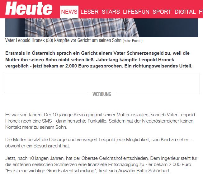 | Schmerzensgeld für Vater, der nicht zum Sohn darf Erstmals in Österreich sprach ein Gericht einem Vater Schmerzensgeld zu! [Quelle: Heute] | Missbrauchen Richter ihre Macht Kinderbesuch nur unter Aufsicht. Kritik an heimischer Justiz - Tausende "Väter ohne Rechte"
