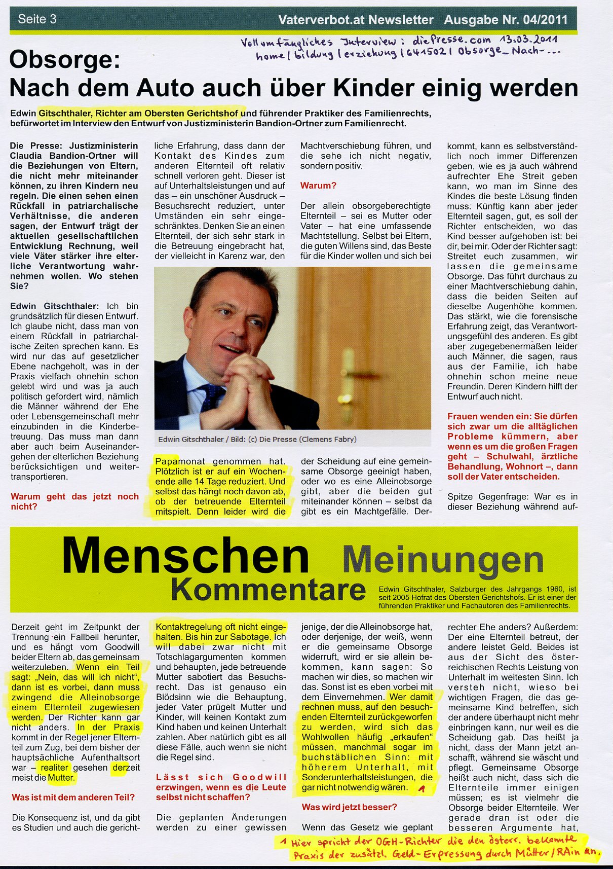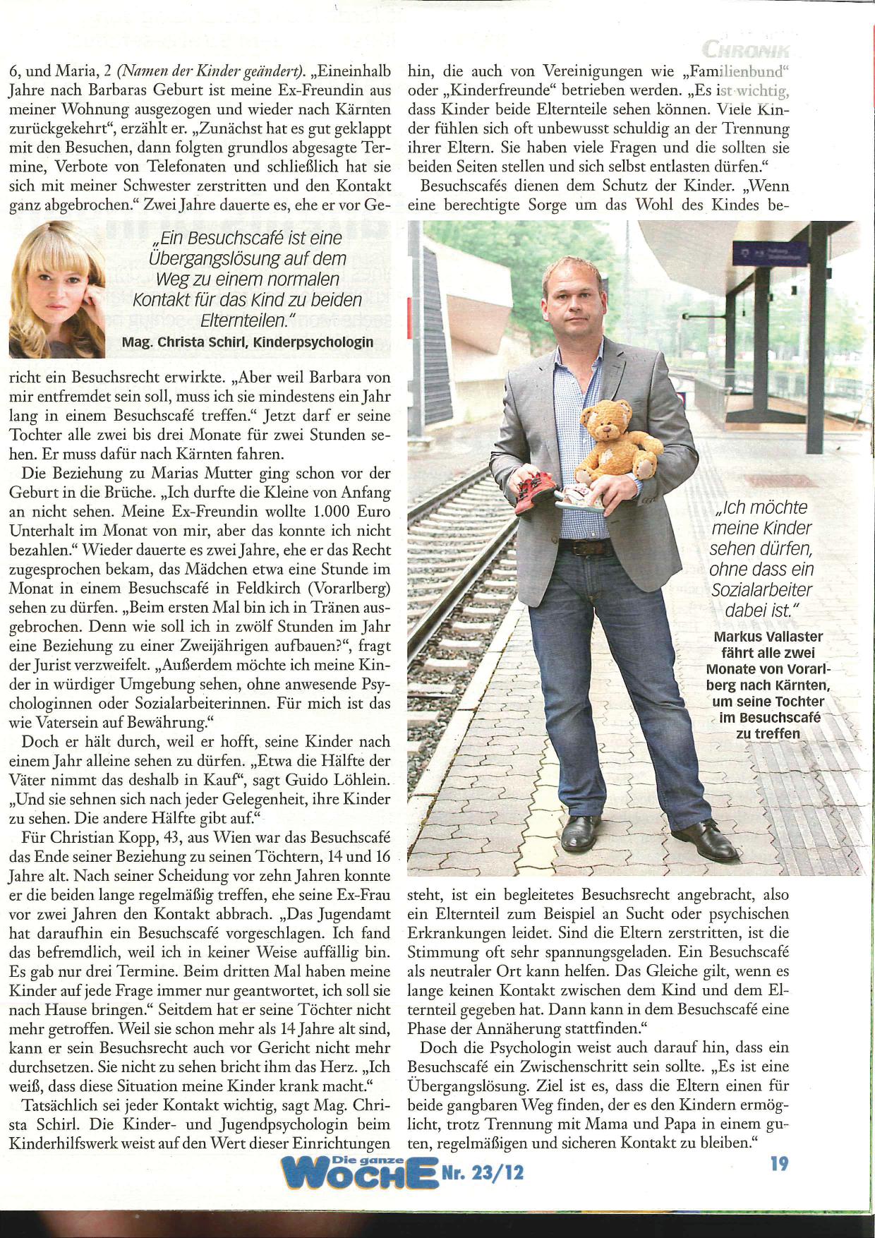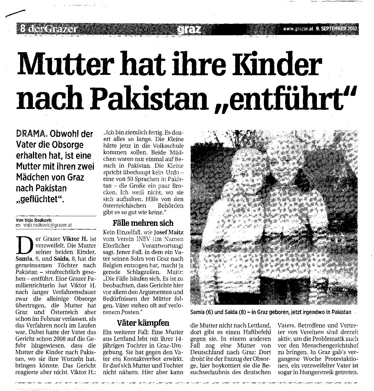 Hungerstreik der Väter Ganzseitiger Artikel in der regional größten Tageszeitung (Kleine Zeitung) der Steiermark über die Vorbereitungen der Voitsberger Gruppe Kinder-Wohl für die Info-Zelt-Tage, Hungerstreik (Fasten-für-unsere-Kinder) und Demo /Mahnwache vor lokalem Gericht in Graz, September 2012. Beinhaltet Interview-Statements des Pressesprechers Stephan Mögle-Stadel und eine Kommentar-Kolumne der Redaktion. _____________________________________________________________________________ Im Zweifel gegen den Angeklagten Fiktive Gewalt durch Väter: Zukünftige Obsorge- und Besucherrechtsverteilung durch die Hintertür [Vaterverbot, Ausgabe Nr.04/2011] _____________________________________________________________________________ 22.04.2012 – Presse – Fall Oliver: Kind rechtmäßig in Dänemark [Quelle: Presse, 22.04.2012] Die Mutter hätte das Kind nicht nach Österreich bringen dürfen, ohne den Vater davon zu verständigen. Die Dänen müssen das Kind nicht den österreichischen Behörden übergeben. Wien. Der Fall Oliver hat in österreichischen und dänischen Medien breite Resonanz gefunden. Der dänische Vater hatte das fünfjährige Kind in Graz vor dem Kindergarten abgewartet und nach Dänemark mitgenommen. Die österreichische Mutter kämpft seither, um ihren Sohn nach Österreich zurückzubekommen. Fakten und Rechtsfragen des internationalen Falls werden unterschiedlich dargestellt. Übereinstimmend wurde in den Medien davon ausgegangen, dass eine Pattsituation vorliege. Eine Analyse der rechtlichen Situation der beiden Länder zeigt aber: Das Kind dürfte sich rechtmäßig in Dänemark aufhalten. Die Mutter war im Zeitpunkt der Übersiedlung nach Österreich allein sorgeberechtigt. Für diese Beurteilung ist dänisches Recht maßgeblich, da sich das Kind vor der Übersiedlung zusammen mit der Mutter in Dänemark aufhielt. Zu diesem Zeitpunkt stellte auch der Vater einen Antrag auf Sorgerechtszuteilung nach dänischem Recht. Die dänischen Behörden entschieden darüber aber erst nach dem Umzug, nämlich im August 2010. Daraus könnte der Schluss gezogen werden, dass die Übersiedlung des Kindes nach Österreich durch die Mutter rechtlich (noch) unbedenklich war. Information vor der Übersiedlung nötig Allerdings verlangt das dänische Recht selbst bei alleiniger Obsorge eines Elternteils, dass dieser den anderen Elternteil mindestens sechs Wochen vor der Übersiedlung darüber in Kenntnis setzt. Grund dafür ist, dass es dann auch einer Neuregelung des Umgangsrechts, also des Kontakts mit dem anderen Elternteil, bedarf. Der Vater wurde von der Mutter gar nicht informiert. Nun sieht das Europäische Sorgerechtsübereinkommen (ESÜ), das die Anerkennung ausländischer Sorgerechtsurteile regelt, vor, dass auch nachträglich ergangene Entscheidungen des Ursprungsstaats (Dänemark) maßgeblich sind. Die Verletzung der Verständigungspflicht ist eine schwerwiegende Verletzung des Kontaktrechts, die in Dänemark dafür sorgen kann, dass die Obsorge auf den anderen Elternteil übergeht. Kindeswohl nicht gefährdet Dem Vater wurde in Dänemark das alleinige Sorgerecht über Oliver übertragen. Eine Übersiedlung des Kindes ohne sein Einverständnis war daher rückblickend betrachtet nicht rechtmäßig. Weil das Kind von der Mutter widerrechtlich ins Ausland gebracht wurde, konnte das Kind auch keinen gewöhnlichen Aufenthalt in Österreich begründen – es sei denn, die hohe soziale Integration des Kindes würde das widerrechtliche Vorgehen der Mutter faktisch überlagern. Ist das Kind nämlich einmal in dem anderen Land sozial integriert, dann würde es möglicherweise seinem Wohl nicht entsprechen, es aus seiner gewohnten Umgebung herauszureißen. Die dänische Entscheidung wäre nur dann nicht anzuerkennen, wenn sie mit dem Kindeswohl offensichtlich nicht vereinbar ist, weil sich seit der (nachträglichen dänischen) Entscheidung die Verhältnisse wesentlich geändert haben. Es muss also ein „klarer Fall“ vorliegen, der keine Zweifel an der offensichtlichen Unvereinbarkeit zulässt. Rechtsvergleichend betrachtet wird jedenfalls ein mehr als bloß sechs Monate dauernder Aufenthalt im anderen Land nötig sein. Manche ESÜ-Vertragsstaaten meinen, dass die offensichtliche Unvereinbarkeit mit der Gerichtsentscheidung nach einer Aufenthaltsdauer von 16 Monaten im neuen Land noch nicht vorliegt, nach Ablauf von drei Jahren aber schon. Die Rückführung des Kindes wäre dann mit dem Kindeswohl unvereinbar. Was bedeutet das nun für den aktuellen Fall Oliver? Hier liegt nach dem ESÜ kein Grund vor, der dänischen Entscheidung die Anerkennung zu versagen. Denn diese ist – so weit ersichtlich – mit dem Kindeswohl nicht unvereinbar. An eine Unvereinbarkeit müsste man strenge Maßstäbe anlegen, das Kind verfügte aber erst über eine bloß kurzfristige Aufenthaltsdauer in Österreich, es kam im Juli 2010 nach Graz. Die (nachträgliche) dänische Sorgerechtsentscheidung wäre also auch in Österreich anzuerkennen (gewesen). Fazit: Die von der Mutter vorgenommene Übersiedlung des Kindes nach Österreich scheint rechtswidrig gewesen zu sein. Die Mutter als zunächst allein Sorgeberechtigte hat den Vater von der beabsichtigten Übersiedlung nicht verständigt. Darin ist eine schwerwiegende Verletzung des nach dänischem Recht bestehenden Umgangsrechts eines Elternteils mit seinem Kind zu erblicken. Dieses Recht müssen beide Elternteile im Interesse des Kindes wahren. Aus Sicht der dänischen Behörden ist nach derzeitigem Stand der Dinge der dänische Vater von Oliver allein sorgeberechtigt. Ein Rückstellungsantrag der österreichischen Behörden nach dem Haager Kindesentführungsübereinkommen ist aus österreichischer Sicht zwar möglicherweise gerechtfertigt. Ihm muss aus dänischer Sicht aber nicht Folge geleistet werden. Das Kind ist so weit rechtmäßig in Dänemark. Wer kann Kontakt besser gewährleisten? Dänisches Recht betrachtet das Umgangsrecht als Recht des Kin