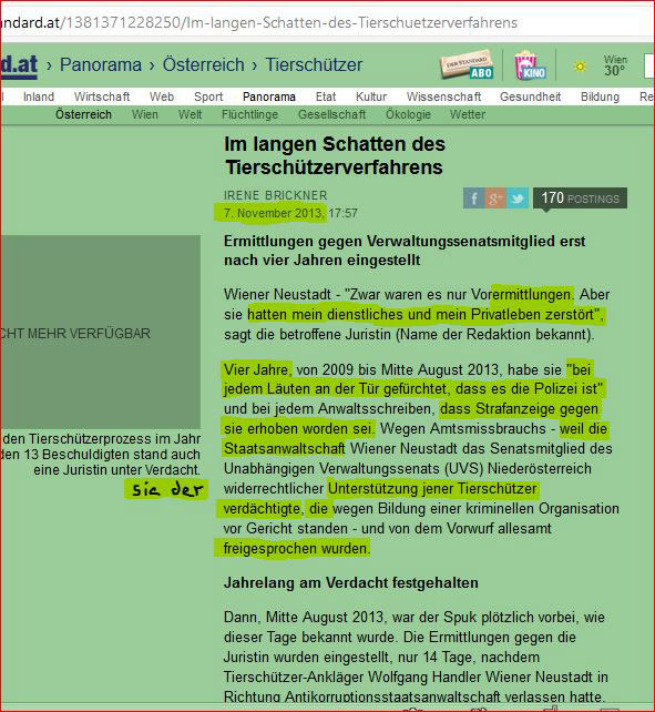 ![]() Sachbuchautor und Menschenrechtler S. Mögle-Stadel trifft Tierschützer in Graz. Überlegung als Verfolgte des Regimes eventu eine gemeinsame Menschenrechtsbeschwerde beim UNO-MRR in Genf gegen das österr. Justizsystem vorzubringen. ![]() Spendenaufruf für Prozesskosten unter: http://www.vgt.at/presse/news/2014/news20140818es_3.php _____________________________________________________________________________Mafiaparagraph gegen Väterrechtler! (§278a - Kriminelle Organisation) §278a des Strafgesetzbuchs, der sogenannte 'Mafiaparagraph' wurde verwendet, um aufmüpfige Gruppen, die den Machteliten in Österreich auf die Nerven gehen, zu kriminalisieren. Bis 29.07.2013 war der Paragraph in folgender Form gültig und sorgte bei vielen Gruppen für Aufsehen: §278a. Wer eine auf längere Zeit angelegte unternehmensähnliche Verbindung einer größeren Zahl von Personen gründet oder sich an einer solchen Verbindung als Mitglied beteiligt (§ 278 Abs. 3),die, wenn auch nicht ausschließlich, auf die wiederkehrende und geplante Begehung schwerwiegender strafbarer Handlungen, die das Leben, die körperliche Unversehrtheit, die Freiheit oder das Vermögen 1. bedrohen, oder schwerwiegender strafbarer Handlungen im Bereich der sexuellen Ausbeutung von Menschen, der Schlepperei oder des unerlaubten Verkehrs mit Kampfmitteln, Kernmaterial und radioaktiven Stoffen, gefährlichen Abfällen, Falschgeld oder Suchtmitteln ausgerichtet ist, 2. die dadurch eine Bereicherung in großem Umfang ODER erheblichen Einfluß auf Politik oder Wirtschaft anstrebt und 3. die andere zu korrumpieren oder einzuschüchtern oder sich auf besondere Weise gegen Strafverfolgungsmaßnahmen abzuschirmen sucht, ist mit Freiheitsstrafe von sechs Monaten bis zu fünf Jahren zu bestrafen. § 278 Abs. 4 gilt entsprechend. Kurt Essmann verhaftet - Terroristen-Papa im Hochsicherheitstrakt So zeigte sich aus Solidarität zu Väteraktivisten FPÖ Abgeördneter Hofer selbst an! [Bericht Quelle: News, 25. Februar 2010] Weil die Staatsanwaltschaft Linz derzeit gegen einige Väter-Aktivisten wegen des Verdachtes der Gründung einer staatsfeindlichen Verbindung ermittelt, will sich der FPÖ-Abgeordnete Norbert Hofer nun aus Solidarität selbst anzeigen. Er sei nämlich für die Plattform "trennungsopfer.at" tätig, erklärte er bei einer Pressekonferenz. Die FPÖ pocht nun auf die Reparatur des sogenannten Mafia-Paragrafen, der auch schon Tierschützern zum Verhängnis wurde, sowie auf das Prinzip der gemeinsamen Obsorge Nächste Woche beginnt in Wiener Neustadt der Prozess gegen jene Tierschützer, die unter anderem nach Paragraf 278a - der Beteiligung an einer kriminellen Organisation - angeklagt werden. Im Vorfeld hatten sich 220 Personen, darunter auch Prominente, aus Protest selbst angezeigt. Hofer will dies nun Anfang nächster Woche aus Solidarität mit den Väter-Aktivisten auch tun. Guido Löhlein und Edgar Neubacher, die Anfang Februar als Beschuldigte nach Paragraf 246 (staatsfeindliche Verbindungen) und Paragraf 278b (terroristische Vereinigungen) eine Ladung des Landespolizeipolizeikommandos Oberösterreich erhalten hatten, verstehen die Ermittlungen nicht, wie sie auf der Pressekonferenz erklärten. "Wir haben keine radikalen Aktionen gesetzt", so Neubacher. Als Mitglieder der ARGE Familienschutz habe man sogar mit dem Justizministerium zusammengearbeitet. Sie wüssten nicht einmal, welche entsprechenden Aktivitäten sie gesetzt haben sollen, denn man verwehre ihnen die Akteneinsicht. "Das sind keine Terroristen", meinte auch Hofer. Der FPÖ-Abgeordnete fordert nun "dringend" eine "Reparatur" der "Mafia-Paragrafen", denn es könne "jeden Verein, jede Bewegung" treffen. Verfehlungen, wie Drohungen gegen Amtsträger der Republik, die einem in Haft sitzenden Väter-Aktivisten vorgeworfen werden, müssten aber verfolgt werden. Im Sinne der Kinder pocht Hofer außerdem auf die Einführung des Prinzips der gemeinsamen Obsorge. Justizministerin Claudia Bandion-Ortner (V) habe diesbezüglich auch schon Interesse signalisiert. Originalbericht [Quelle: News 25.Februar 2010] Auch der Paragraph 278a wurde nach langen Wirrungen inzwischen doch reformiert und durch eine Ergänzung entschärft, die als unabdingbare Voraussetzung für eine Anklage nach diesem Gesetz die Bereicherungsabsicht vorsieht. REFORM §278a: 1. Wer eine kriminelle Vereinigung gründet oder sich an einer solchen als Mitglied beteiligt, ist mit Freiheitsstrafe bis zu drei Jahren zu bestrafen. 2. Eine kriminelle Vereinigung ist ein auf längere Zeit angelegter Zusammenschluss von mehr als zwei Personen, der darauf ausgerichtet ist, dass von einem oder mehreren Mitgliedern der Vereinigung ein oder mehrere Verbrechen, andere erhebliche Gewalttaten gegen Leib und Leben, nicht nur geringfügige Sachbeschädigungen, Diebstähle oder Betrügereien, Vergehen nach den §§ 104a, 165, 177b, 233 bis 239, 241a bis 241c, 241e, 241f, 304 oder 307, in § 278d Abs. 1 genannte andere Vergehen oder Vergehen nach den §§ 114 Abs. 1 oder 116 des Fremdenpolizeigesetzes ausgeführt werden. 3. Als Mitglied beteiligt sich an einer kriminellen Vereinigung, wer im Rahmen ihrer kriminellen Ausrichtung eine strafbare Handlung begeht oder sich an ihren Aktivitäten durch die Bereitstellung von Informationen oder Vermögenswerten oder auf andere Weise in dem Wissen beteiligt, dass er dadurch die Vereinigung oder deren strafbare Handlungen fördert. 4. Hat die Vereinigung zu keiner strafbaren Handlung der geplanten Art geführt, so ist kein Mitglied zu bestrafen, wenn sich die Vereinigung freiwillig auflöst oder sich sonst aus ihrem Verhalten ergibt, dass sie ihr Vorhaben freiwillig aufgegeben hat. Ferner ist wegen krimineller Vereinigung nicht zu bestrafen, wer freiwillig von der Vereinigung zurücktritt, bevor eine Tat der geplanten Art ausgeführt oder versucht worden ist; wer an der Vereinigung führend teilgenommen hat, jedoch nur dann, wenn er freiwillig durch Mitteilung an die Behö