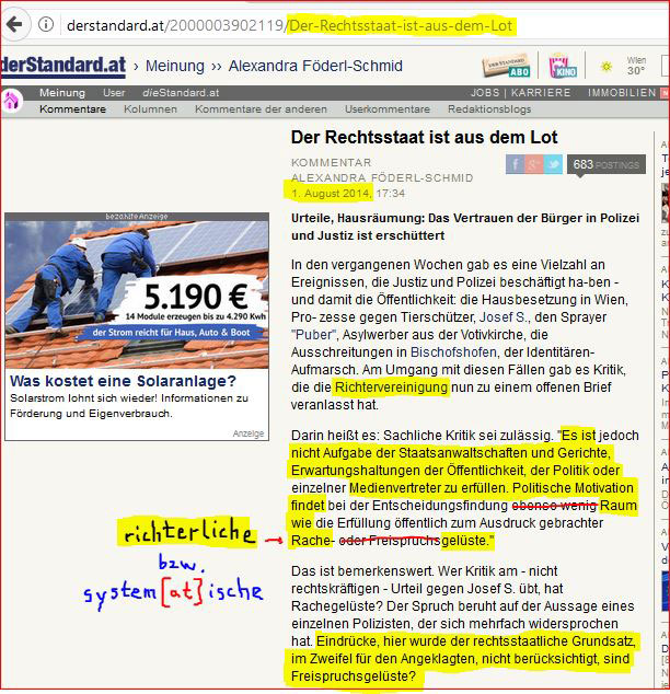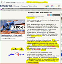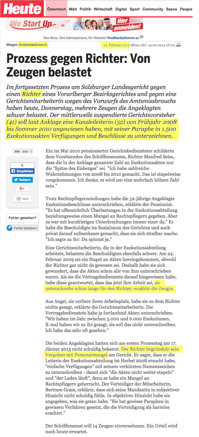 Bestrafung eines (zu) ehrlichen Richters! Ein ehrlicher Richter aus Innsbruck hat Verfahrens-Kritik am Grazer Gericht geübt, wurde des Zuschauerraumes verwiesen und verlor seine Stelle als Pressesprecher... ![]() | |||||||||||||||||||||||||||||||||||||||||